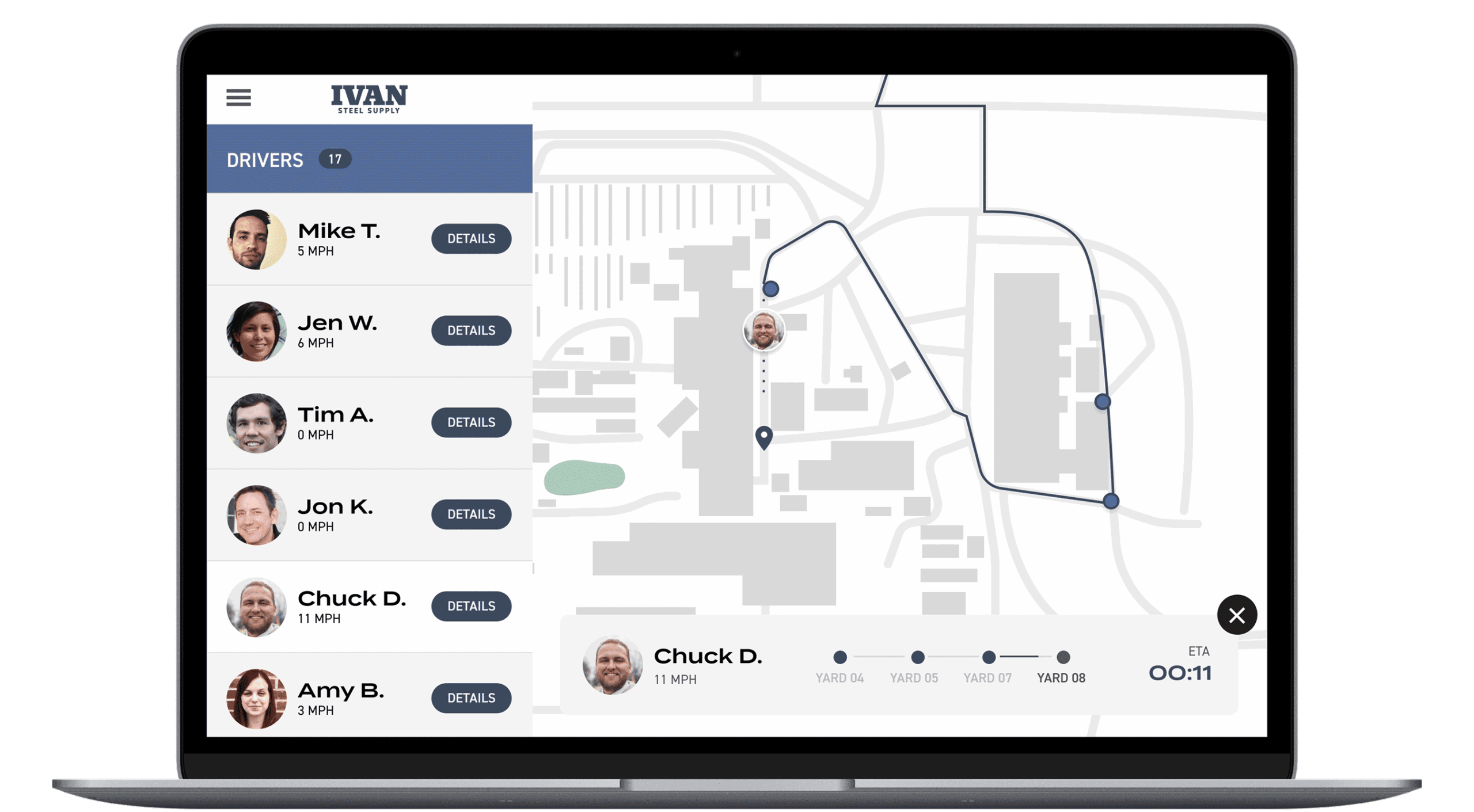 As drivers follow their routes, your on-site team can view their location in real time — allowing for better staging, faster load prep, and proactive communication when delays or missed turns occur.