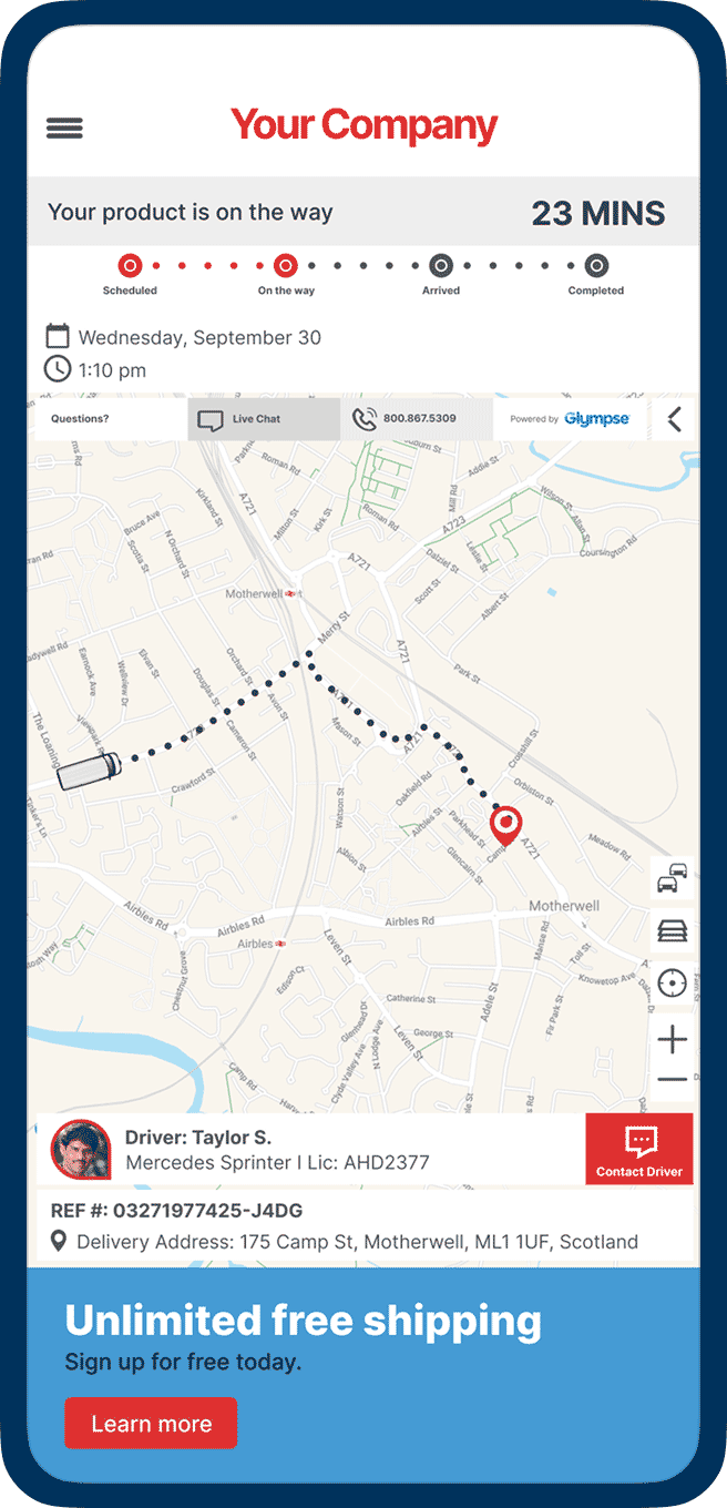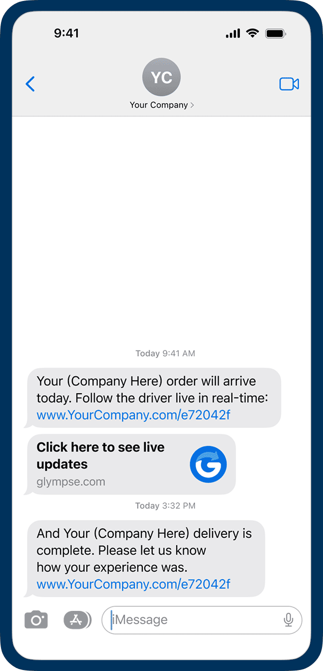 Glympse + AI delivers smarter product delivery, pickup, and reverse logistics experiences. Customers never have to wonder when their order will arrive—or when a return or pickup will be completed. They receive branded text, email, or in-app notifications with a secure link that opens a live map—no app required. From order confirmation to final delivery or return, customers see real-time progress and proactive updates, building confidence and reducing “Where’s my order?” calls.