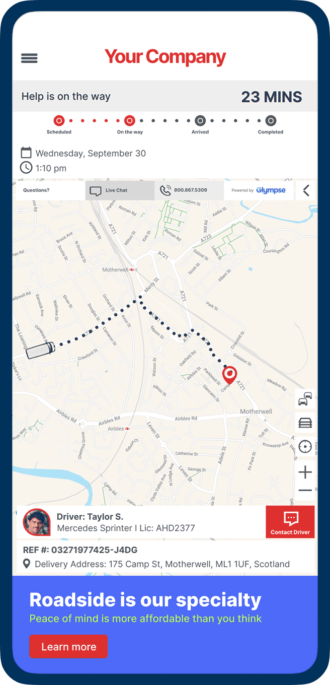 Glympse + AI delivers smarter service experiences. Stranded drivers never have to wonder when the service vehicle will arrive. They receive a branded text, email, or in-app notification with a secure link that opens a live map; no app required. From first call for help to appointment completion, stranded customers or members see real-time progress of the service vehicle and proactive updates, building confidence and reducing “When will help arrive?” calls.